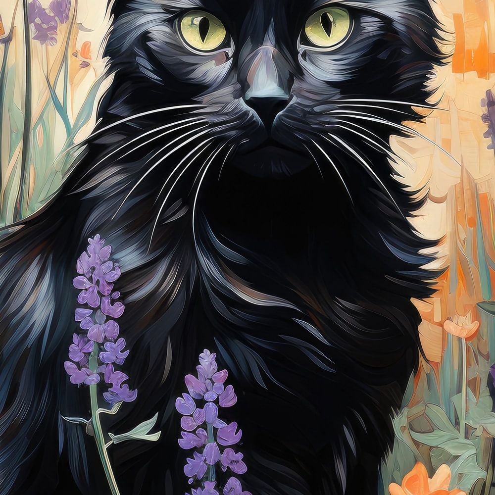 Cat and flowers inspired by Vincent van Gogh. Whimsical funny black cat surrounded by a grass and colorful flowers. Funny furry animals. Fine art oil painting, digital art.