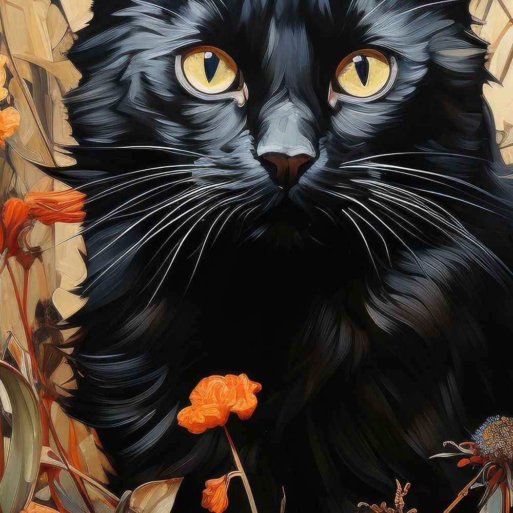 Cat and flowers inspired by Vincent van Gogh. Whimsical funny black cat surrounded by a grass and colorful flowers. Funny animals, floral art. Funny animals, floral art. Fine art, oil painting, digital art.
