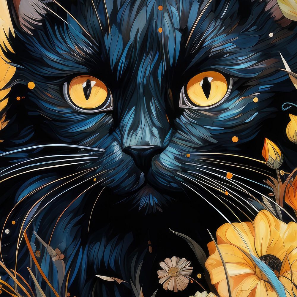Cat and flowers inspired by Vincent van Gogh. Whimsical funny black cat surrounded by a grass and colourful flowers. Funny animals, floral art. Funny animals, floral art. Fine art oil painting.