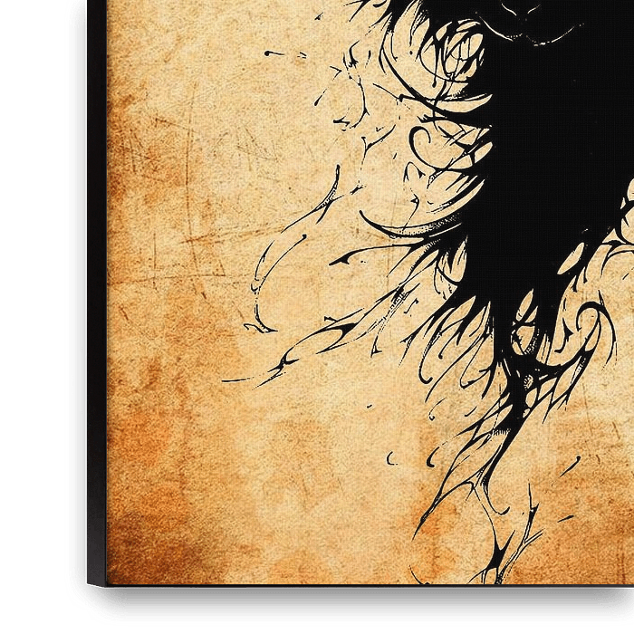 The image features a black cat silhouette with piercing yellow eyes, rendered in a dramatic ink style. The cat's fur is depicted with intricate, flowing lines that create a sense of movement and energy. The background is a textured, aged parchment paper, adding a vintage and mysterious feel to the artwork.