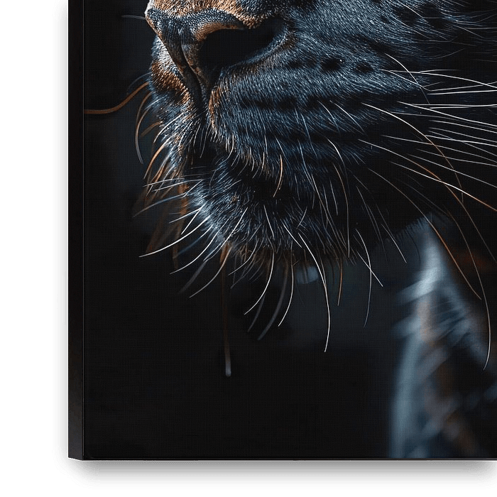 On a black canvas stands the Black Panther, his majestic stature like a shadow in the night. Its glossy fur contrasts with the darkness, while its penetrating eyes exude an aura of power and mystery. The panther seems to float on the black canvas, a symbol of grace and wildness caught in the stillness of the night.
