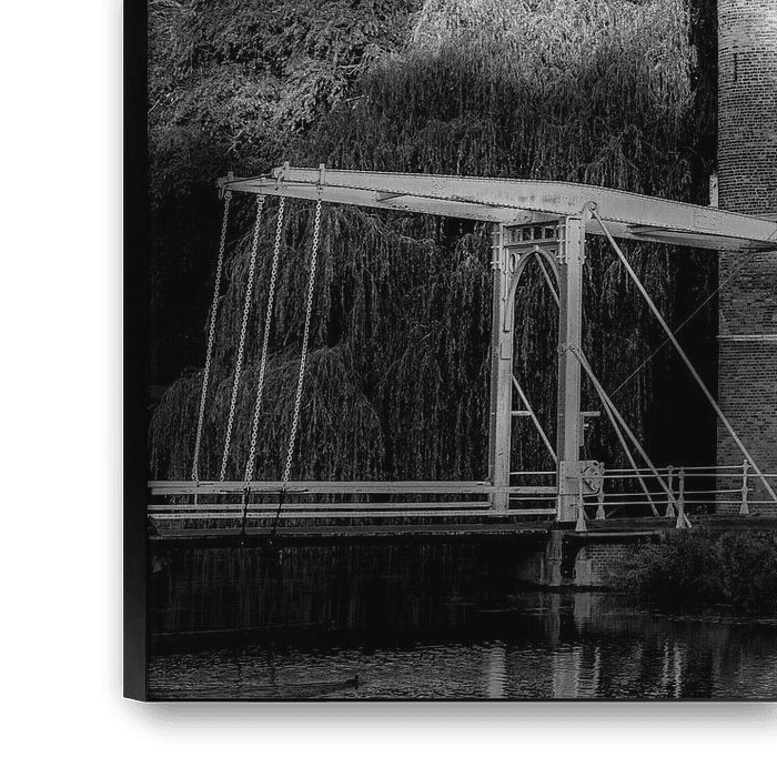 Oosterpoort in Delft at the crack of dawn. The rising sun slowly illuminates one of the two towers of the gate. Through the trees, the Nieuwe Kerk is also visible in the background.