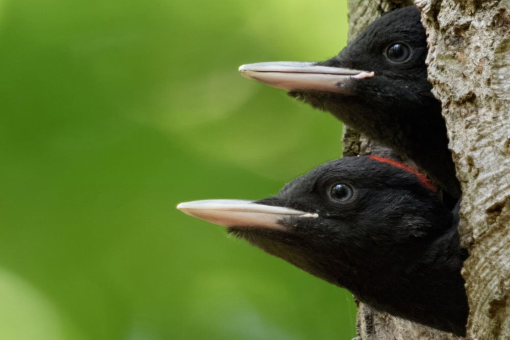 Black Woodpecker ( Dryocopus martius ) young birds in nest hole, male and female together, watching out of nest hole, looks funny, wildlife, Europe.