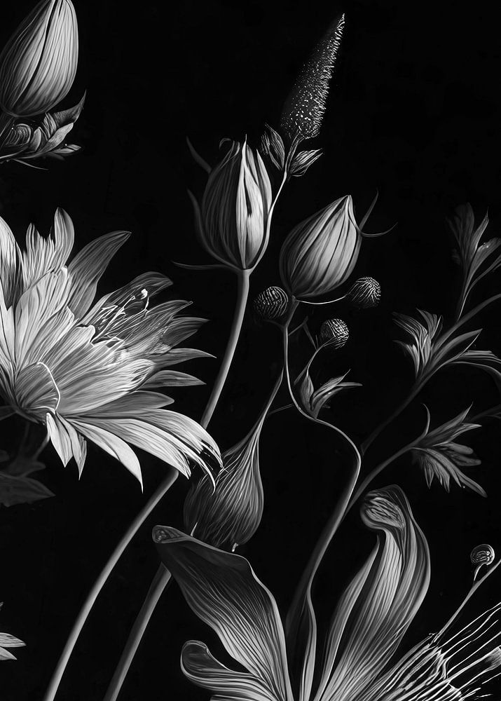 A black and white still life shows a delicate flower arrangement against a stark black background. The image shows a variety of blooms, including a large, open flower with intricate details, several closed buds and slender stems with delicate leaves. The flowers are in shades of grey and convey a sense of elegance and simplicity. ©11-2024 by Pia Schneider, atelier COLOUR-VISION