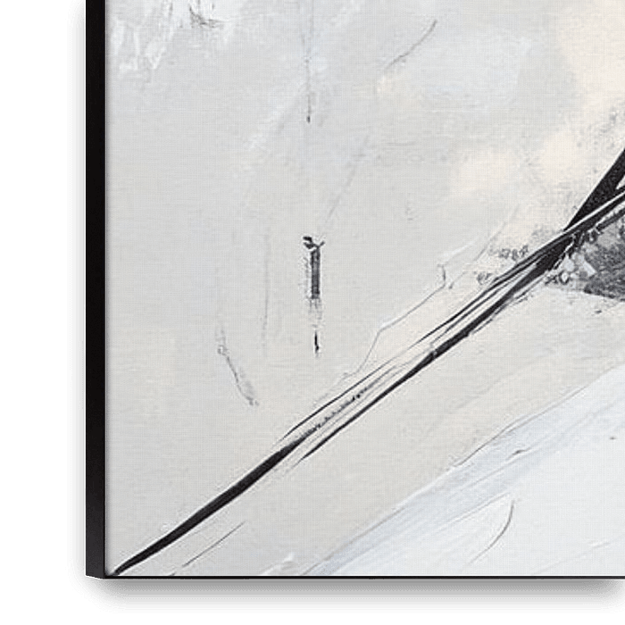 A powerful contrast between brilliant white and deep black pervades the canvas and conveys a sense of movement and dynamism. Delicate strokes and bold brushstrokes meet, while a sense of mist and light work in the background. This composition unleashes a quiet but haunting intensity that is thought-provoking.