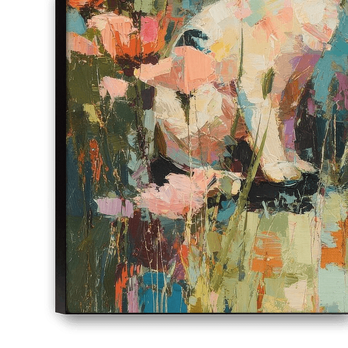 A black and white cat sits in the garden, surrounded by colourful flowers and butterflies. The abstract oil painting captivates with soft tones, large brushstrokes and a harmonious colour palette that gives the impression of artistic freedom. Warm colours create an inviting, peaceful atmosphere, while the cat in the centre emphasises the natural beauty of the garden. The artwork combines playfulness and elegance and at the same time looks modern and expressive.