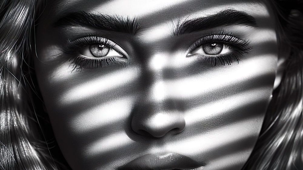 The woman looks straight into the lens with a piercing gaze, her eyes laced with a mix of mischief and depth. Her wavy hairline is artfully captured, with subtle shadows framing her face. The composition may emphasise certain details, such as her sensuous lips, suggesting strength and sophistication.