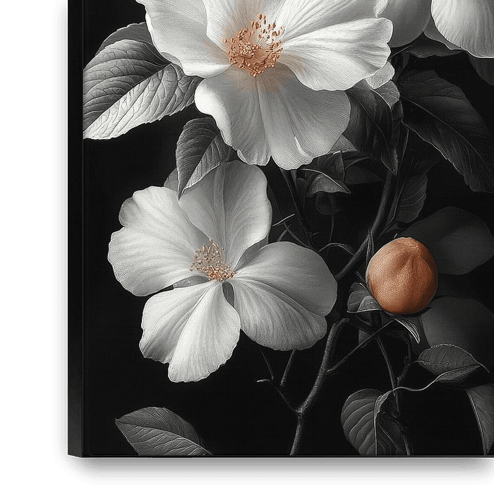 Buy this flower art Black and white still life of flowers and fruit in extremely dramatic light by Gelissen Artworks on canvas, ArtFrame, poster and wallpaper, printed on demand in high quality.