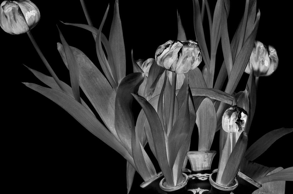Black and white still life of wilted red tulips in a Delft blue tulip vase by WorldWidePhotoWeb