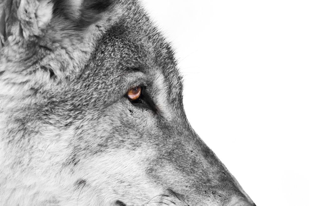 About "Black and white with colored eyes, a view of the distance Split a wolf of male in profile on a white"