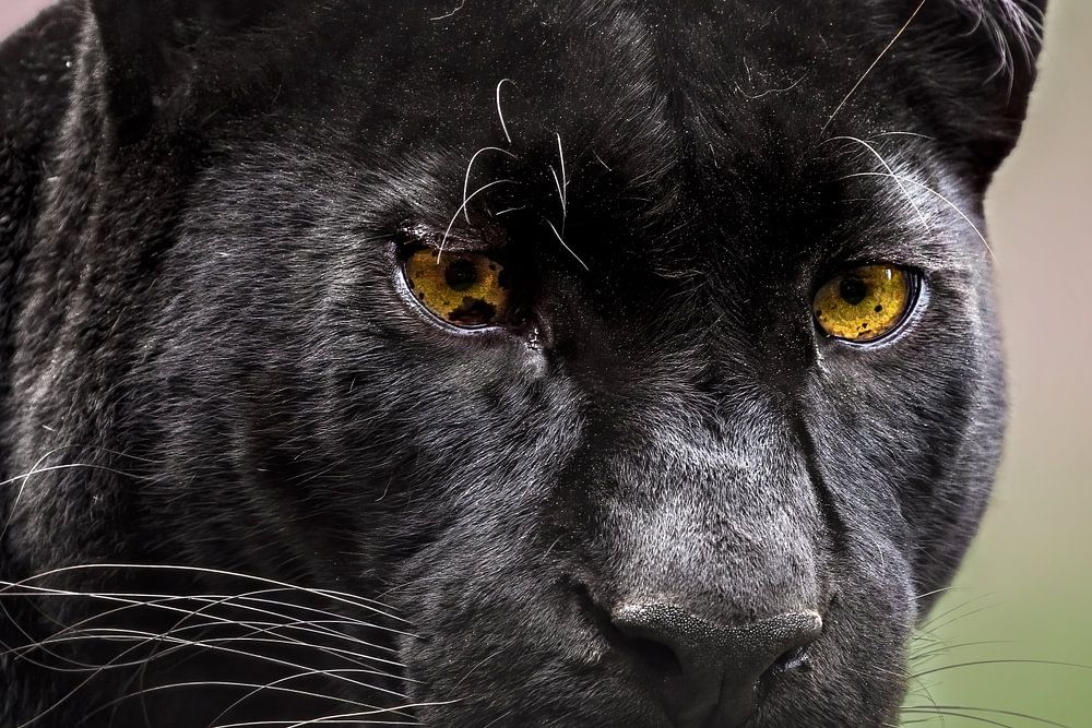 Portrait of a black panther (leopard) with a green background. The black panther is also known as black leopard.