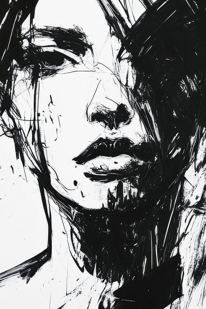 A captivating interplay of deep black strokes and passionate uncertainty unfolds. The intense expressiveness of the face, framed by dynamic, wild lines, captures the boundary between vulnerability and strength. Eyes, penetrating and mysterious, invite the viewer to immerse themselves in the emotional depths.