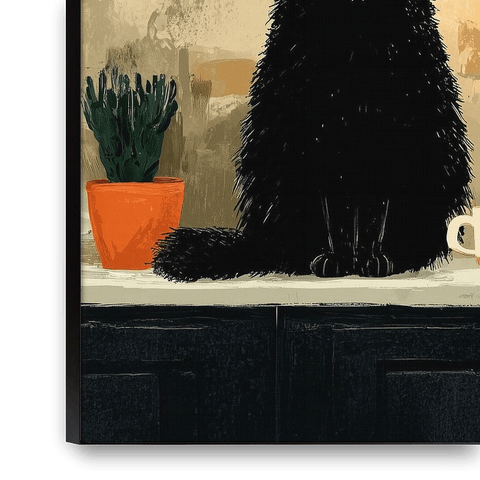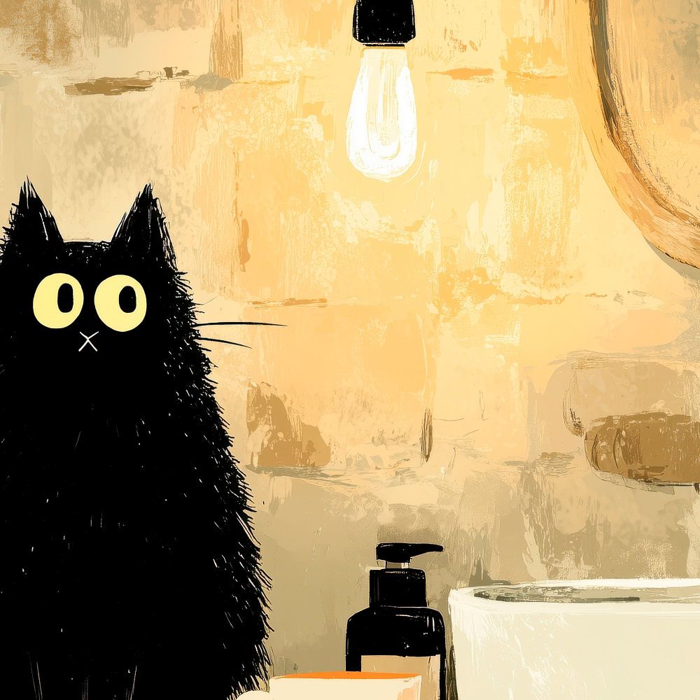 This work of art shows a black cat sitting calmly on the washbasin, surrounded by everyday objects and soft green tones. Plants, small bottles and ceramics create a familiar bathroom atmosphere in which seemingly nothing special happens - and yet everything has its meaning.