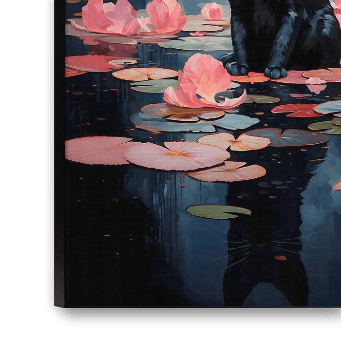 Buy this digital art artwork Black cat and water lilies by NJ Midnight Studio as a reproduction on canvas, ArtFrame, poster and wallpaper, printed on demand in high quality.