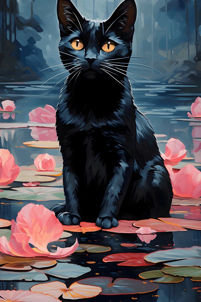 Black cat and water lilies by NJ Midnight Studio