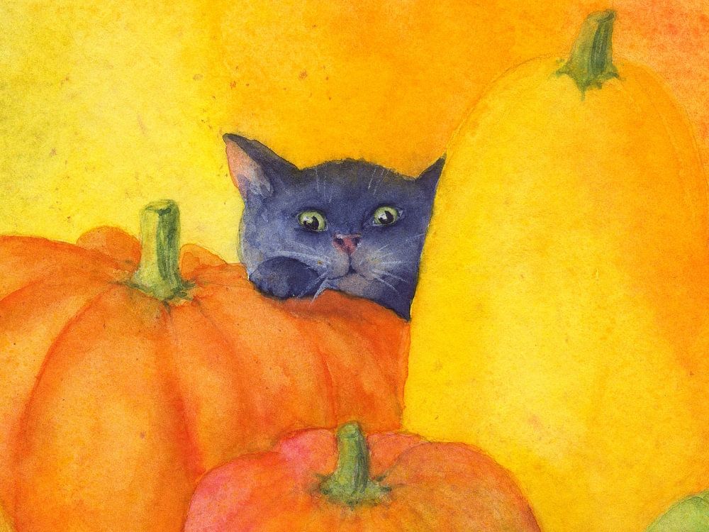Black cat peeking behind pumpkins is a hand-painted watercolour by artist Karen Kaspar. It is perfect for autumnal home decoration and for anyone who likes cute rather than scary images for Halloween. It also makes a wonderful colourful accent for children's rooms or for the autumnal kitchen or dining room.