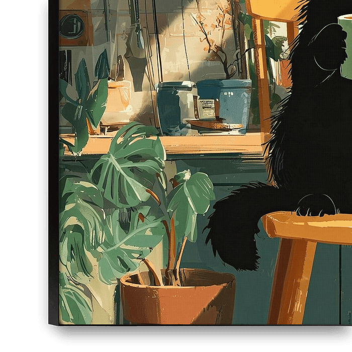 This illustration shows a black cat sitting calmly on a chair in a sun-drenched kitchen, holding a cup in its paws. Surrounded by houseplants, ceramics and warm light, it creates a quiet moment of everyday life.