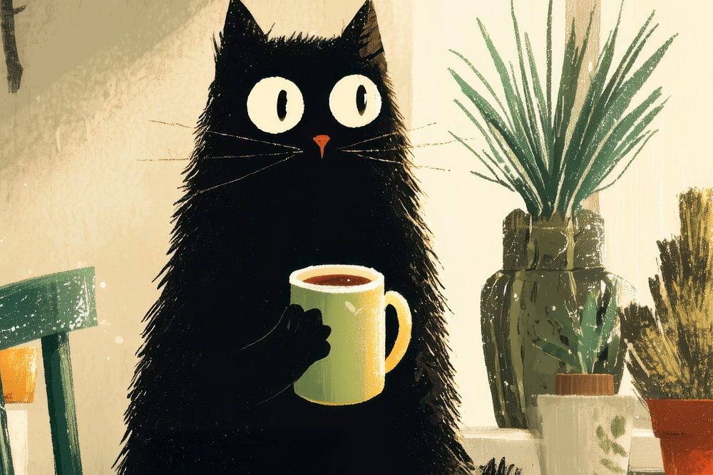A black cat sits quietly on the kitchen worktop, a warm cup in its paws. Around it are plants of various shapes and sizes – cacti, succulents and green leaves that glow in the soft light from the window. The scene feels familiar and quiet, almost as if it happened by chance. And yet everything seems to be just as it should be.