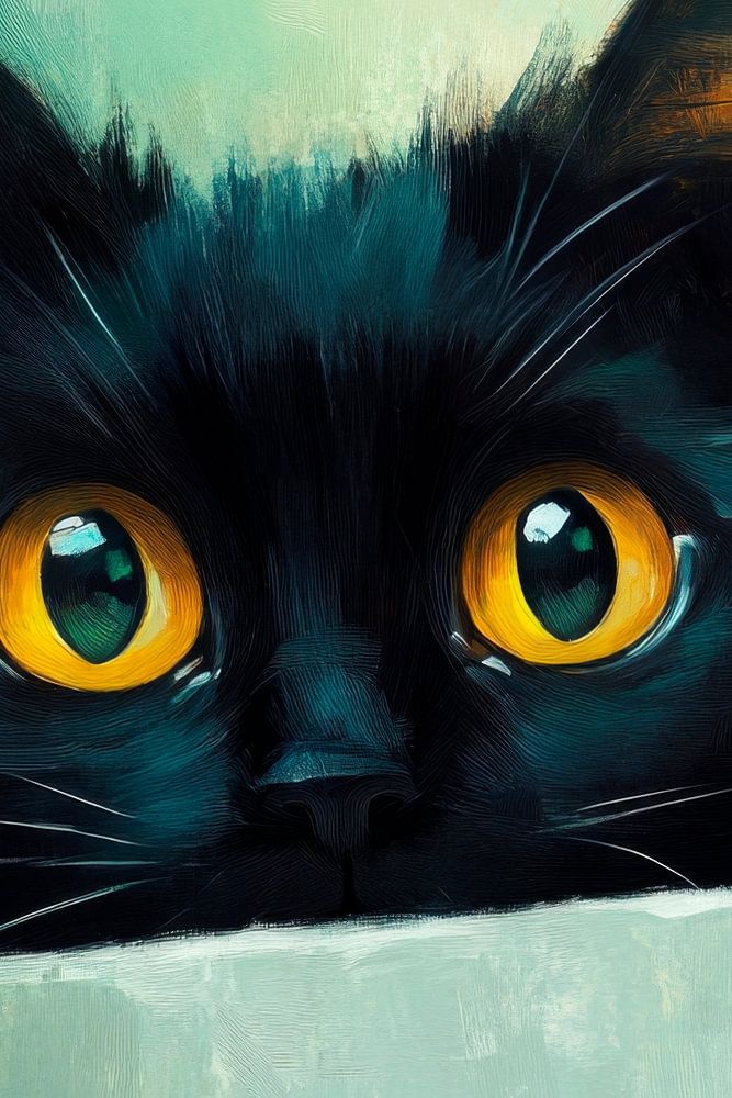 A mysterious moment, captured in bright, amber-coloured eyes that shine with curiosity and playfulness. A black coat shimmers softly in the light, while a delicate head peeks casually from behind a wall. This feline presence exudes both grace and a touch of innocent charm, ready to discover the next adventure.
