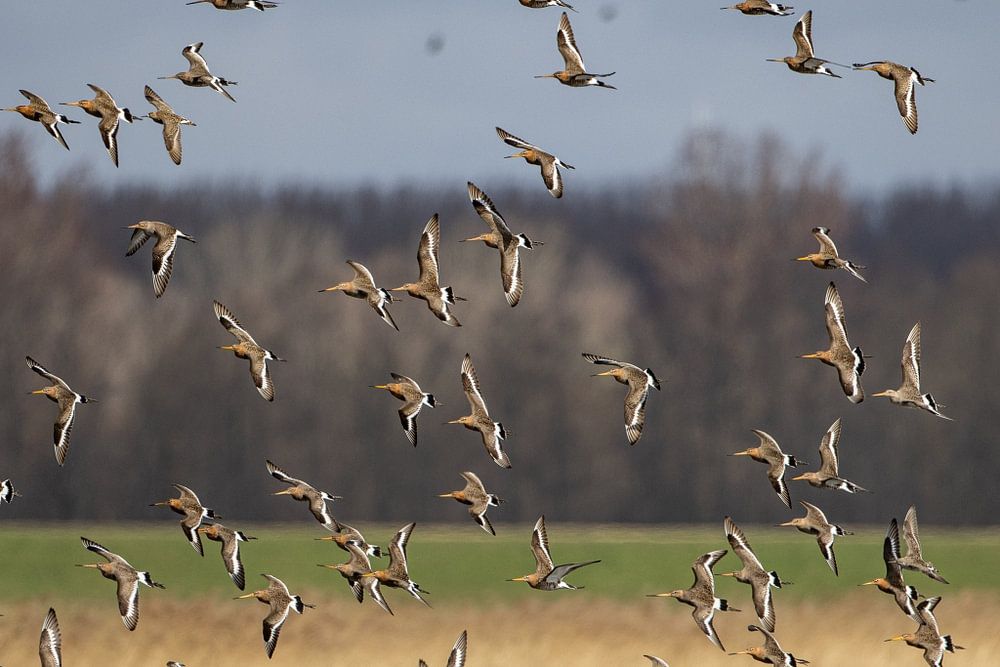 A photo of a group of Black-tailed Godwit (waders) in flight in the polder of Arkemheen
