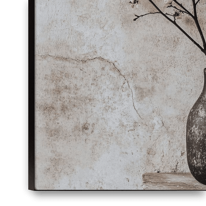 An elegant and minimalist design that fits perfectly into a modern interior. This image shows a simple black ceramic vase filled with a delicate blossom branch, placed against a rustic, textured wall. The warm tones and natural look make this design ideal for a serene and stylish atmosphere in your home. Perfectly suited for living…