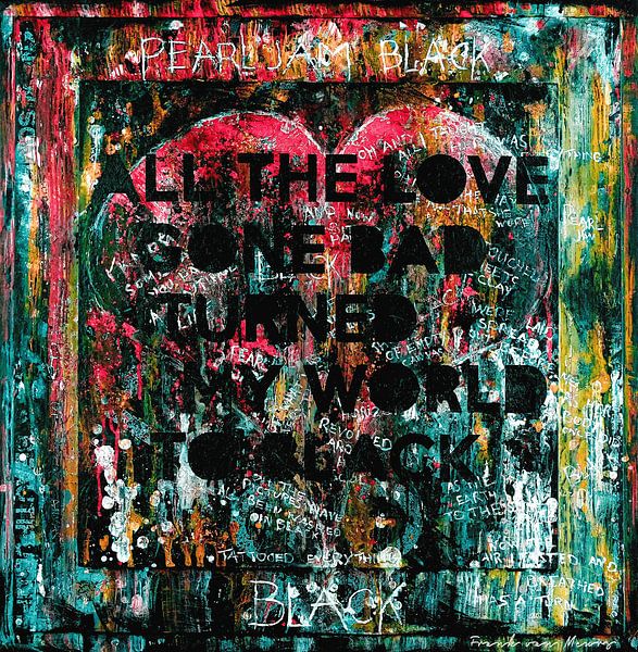 This painting is inspired by the grunge song "Black". I tried to incorporate the atmosphere of "Black" into the painting by using black letters and a background consisting of several layers, among other things. The painting is composed of layers of acrylic paint and varnish that were partly sanded a scraped with a putty knife.