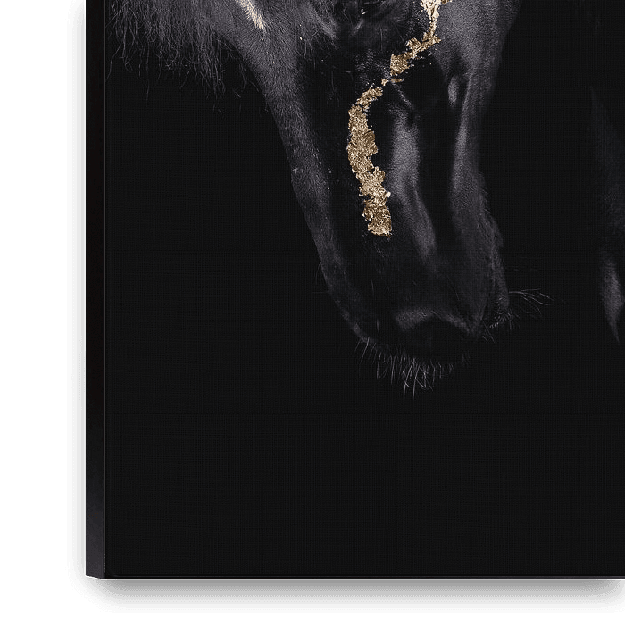 This is a Black photo of a horse (Friesian). This photo was taken in a studio setting. The horse has a nice curve in its neck. This photo was taken against a black background. Gold foil emphasises the horse's physique.