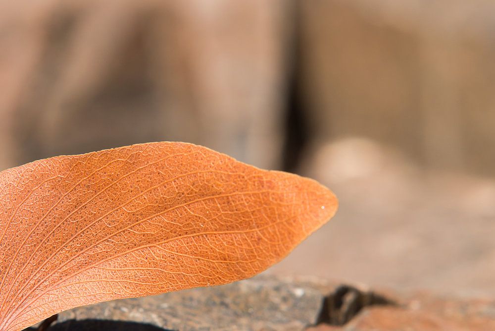 De kleuren combinatie van het blaadje, de rots en de achtergrond is heel erg mooi.