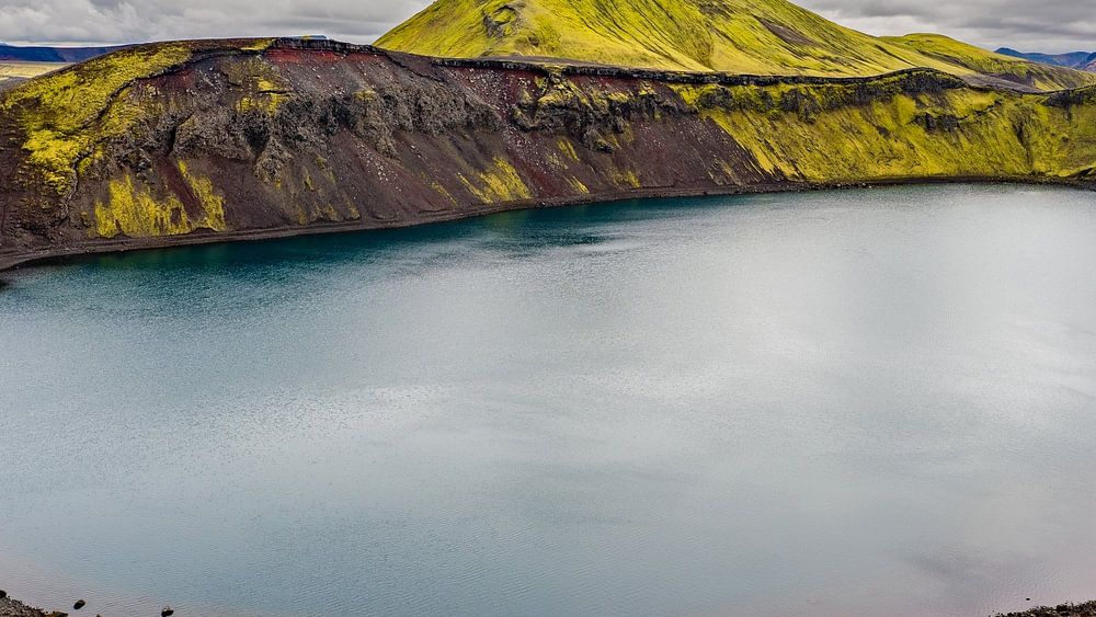 Panorama of spectacular crater lake in Iceland. Hnausapollur (Bláhylur) or blue pool crater lake. Fjallabak nature reserve. Iceland