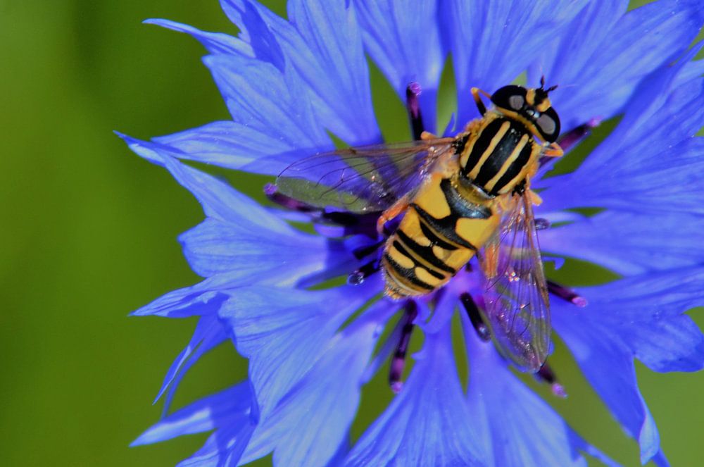 Deze Gewone pendelvlieg is aan het genieten van de nectar van de Korenbloem.