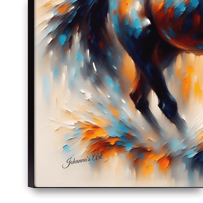 A dynamic horse leaps to life across the canvas, its flowing mane and tail captured in a cascade of vibrant shades that radiate energy and vitality. Each line and curve of the horse’s form conveys motion, strength, and elegance, creating a sense of life that seems to pulse from the painting itself. The animal’s powerful stance embodies…