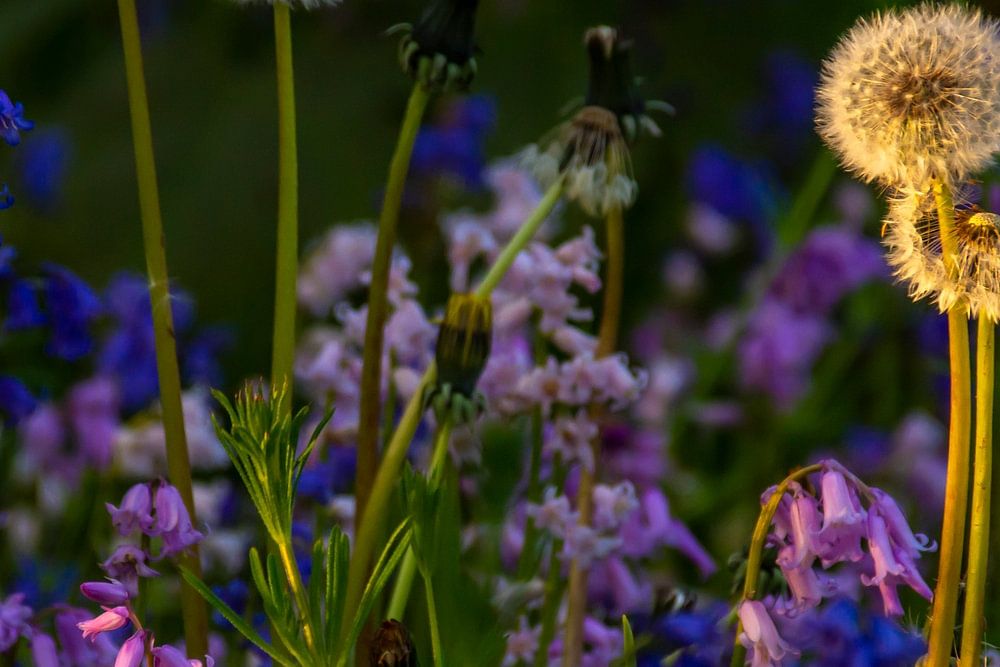 Dandelions blooming between the wild hyacinths in the Wildrijk in Sint Maartenszee, Noord-Holland at sunset.