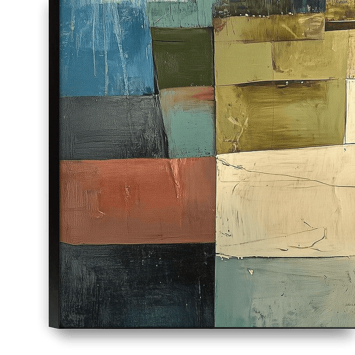 Blocks | Earth tones Blocks - This abstract painting shows large rectangular blocks and layers of paint in earth tones and cream, with striking petrol blue, ochre and orange areas and rough palette knife texture, a clearly abstract painting and abstract painting.