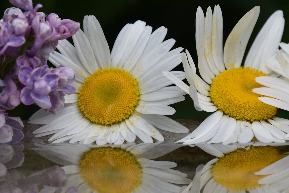 Bloemen in een plas water in de tuin, Sainte-Apolline, Québec, Canada