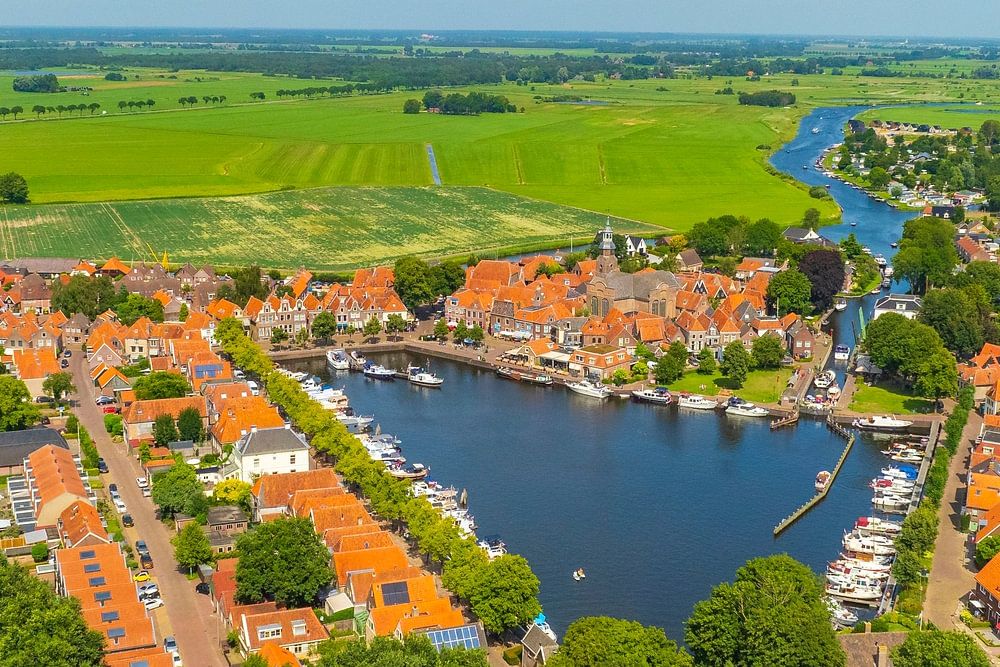 Aerial view on the town Blokzijl in Overijssel, The Netherlands during a beautiful summer day. The old city of Blokzijl is a populair place for tourists to visit.