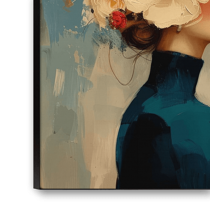 Bloom, Baby, Bloom! The flower girl, modern and abstract portrait of a young woman in blue with large flowers on her head. This work will bring spring and summer into your home!