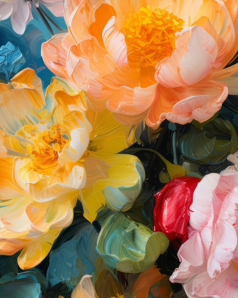Colourful work starring flowers with the title: "Bloom baby, bloom!" With this work on the wall, you will never have to get fresh flowers in the house or change water again. This will make you happy, won't it?