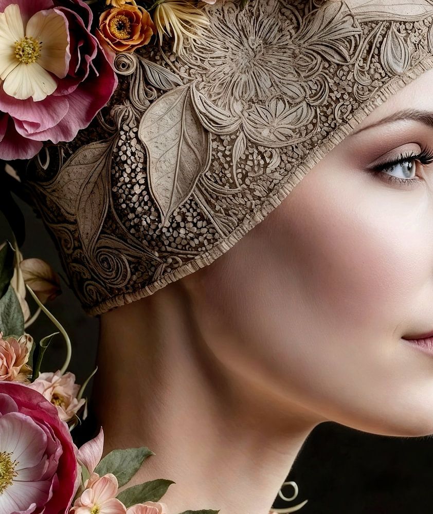 This work combines the graceful elegance of the past with modern digital techniques to create an image that is both mysterious and enchanting. The woman, depicted in a side view, wears a richly decorated head covering with beautifully detailed flowers. Her serene facial expression exudes calm and wisdom, while the flowers symbolise natural beauty and impermanence. The golden halo around her head gives her an almost divine aura, adding to the mystical atmosphere and reminiscent of religious iconography from days gone by.