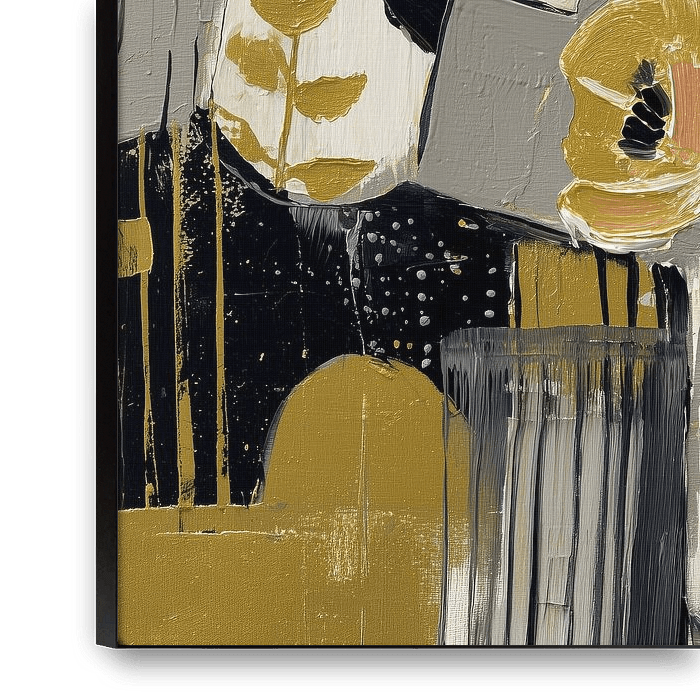 In *Blooming Contours*, a world unfolds where lines and flowers intertwine like poetry in motion. The figure appears to be dreaming with her eyes closed, surrounded by golden petals that float around her like gentle thoughts. The painting pulsates with a quiet energy – a dance of colour, emotion and form that invites us to rediscover it…