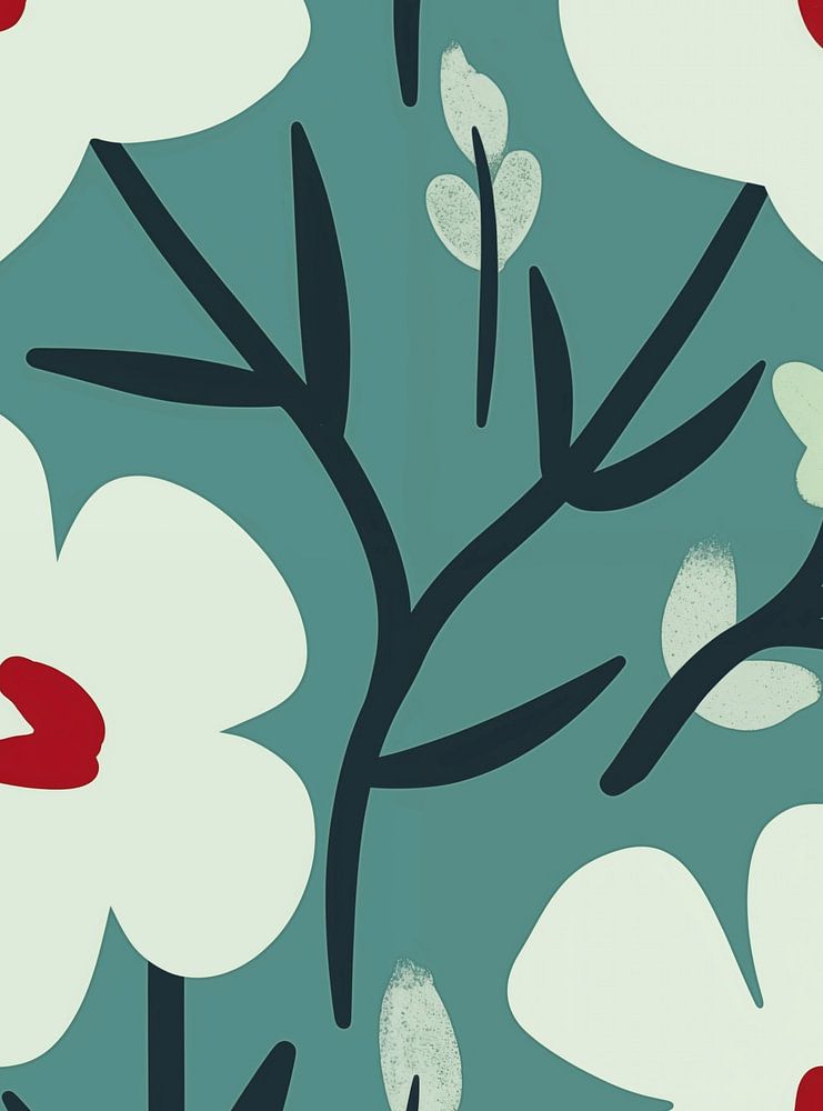 Charming flowers against a plain, blue-green background. The flowers are white with red hearts and black stems, creating a strong contrast that makes them stand out. The composition is minimalist and stylised, with an emphasis on the shape and colour of the flowers rather than detailed textures.