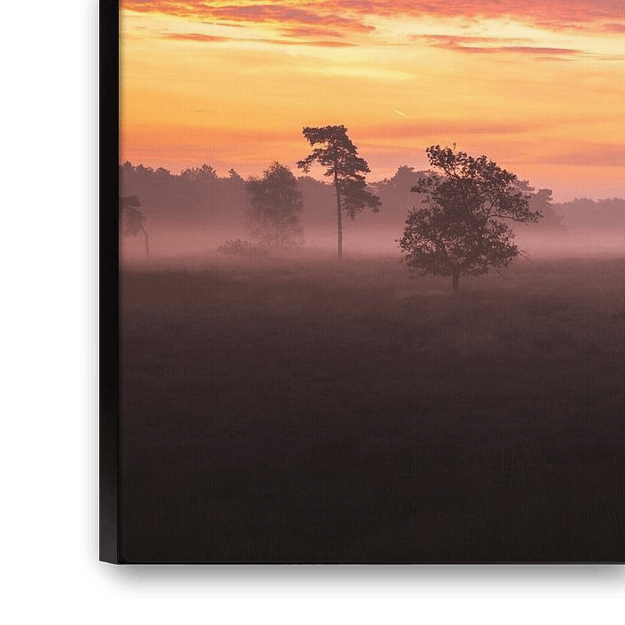 A dreamy scene unfolds on the Loonse en Drunense Duinen, where the blooming heather is enveloped by a soft mist and a sky full of breathtaking pink and orange hues. The first light of the sunrise casts a warm glow over the landscape and makes the purple hues of the heaths shine even deeper.