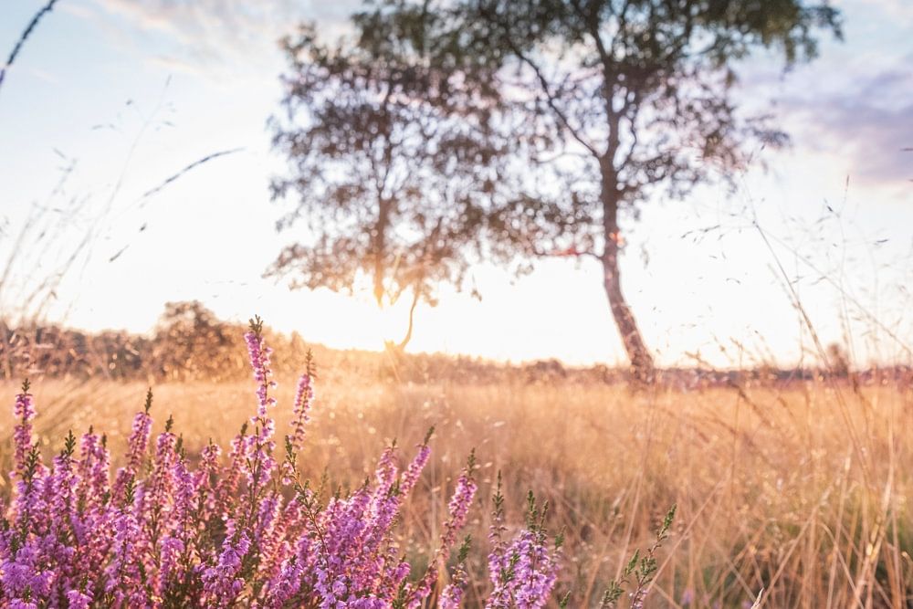 About "Blooming Heather plants in Heathland landscape during sunrise in"