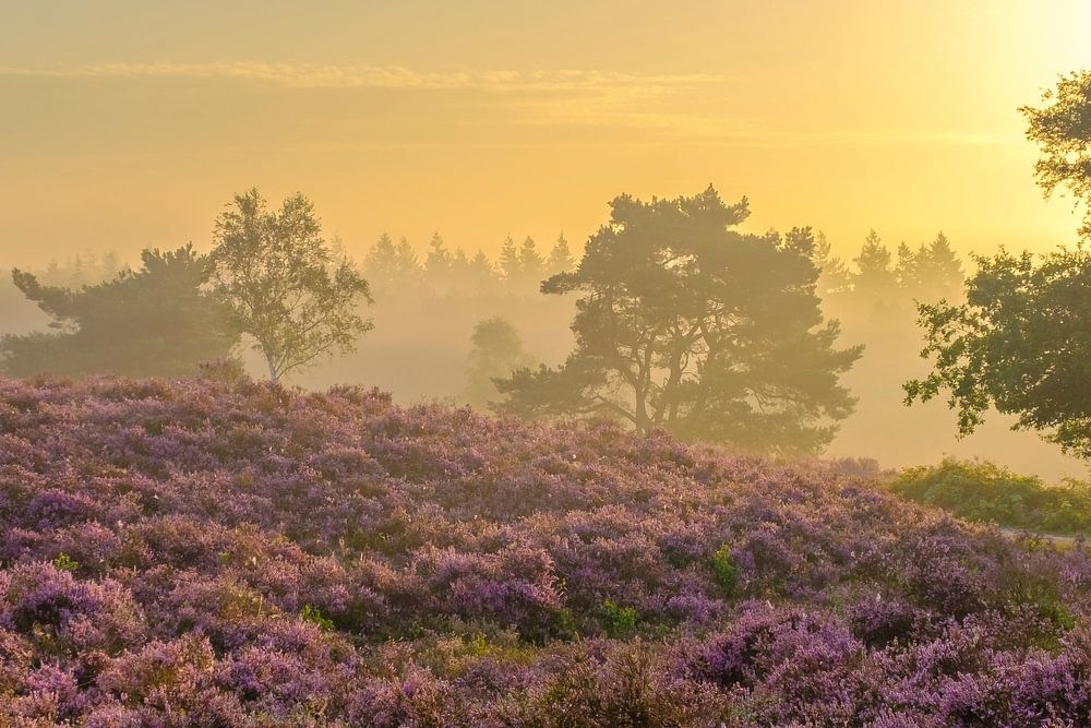 About "Blooming Heather plants in Heathland landscape during sunrise"