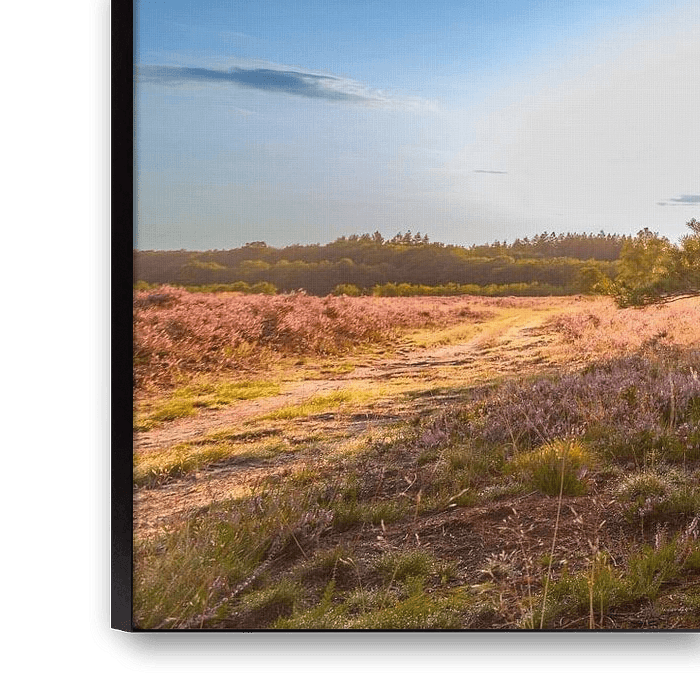 Blossoming Heather plants (Calluna vulgaris) in the Veluwe nature reserve heathland landscape during sunrise in summer in Gelderland, Netherlands. A pine tree is standing tall on the moors at the Renderklippen.