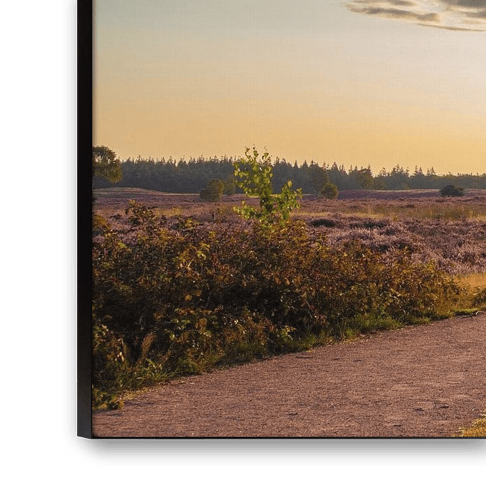 Blossoming common heather plants (Calluna vulgaris) in the Veluwe nature reserve heathland landscape during sunrise in summer
