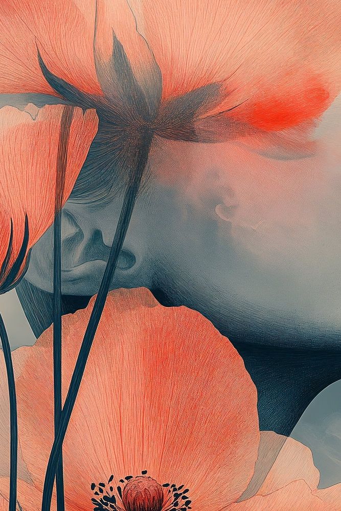 This artwork merges the soft contours of a feminine profile with the delicate beauty of poppies in a double exposure. Against a dreamy, blue-gray background, graceful flowers in warm tones of coral and peach unfold, blending seamlessly into the elegant lines of the face. This surreal composition evokes a feeling of inner growth and harmony with nature. The detailed rendering of the petals contrasts with the ethereal quality of the female form, resulting in a play of reality and fantasy. This work invites the viewer to contemplate the connection between humans and nature, and the beauty that arises when boundaries fade.