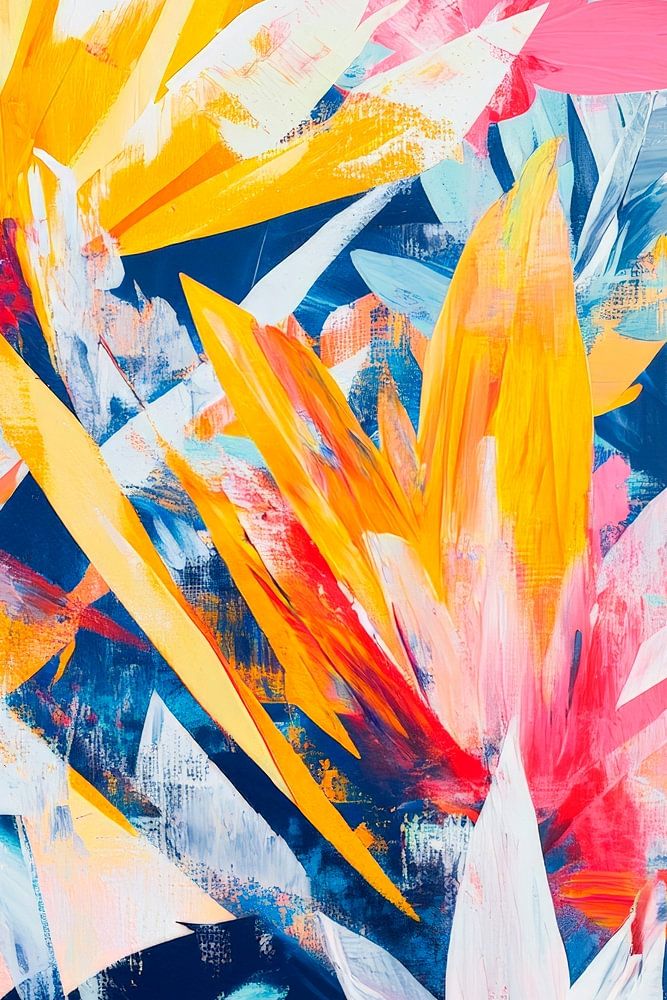 A vibrant interplay of bright colours and dynamic shapes brings a tropical summer landscape to life. The energetic yellow and pink flowers dance against a deep blue background that promises freshness and joy. This artwork is perfect for the living room to create an inviting and inspiring atmosphere.