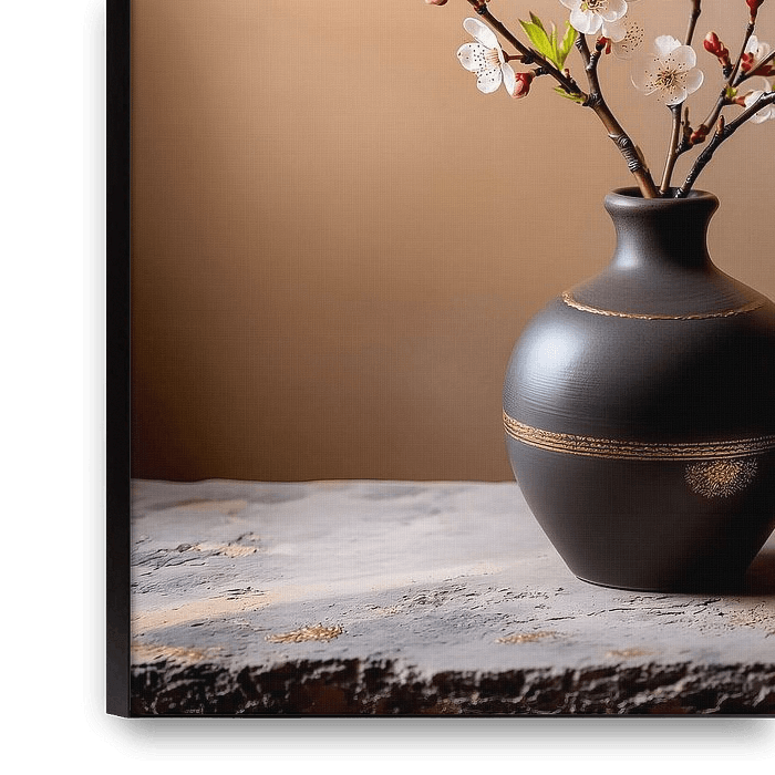 An elegant still life composition featuring blooming cherry blossom branches in a matte dark ceramic vase with subtle gold detailing. Soft side lighting highlights the delicate white blossoms and red buds against a warm, minimalist background. A harmonious blend of refinement, tranquility, and timeless beauty.
