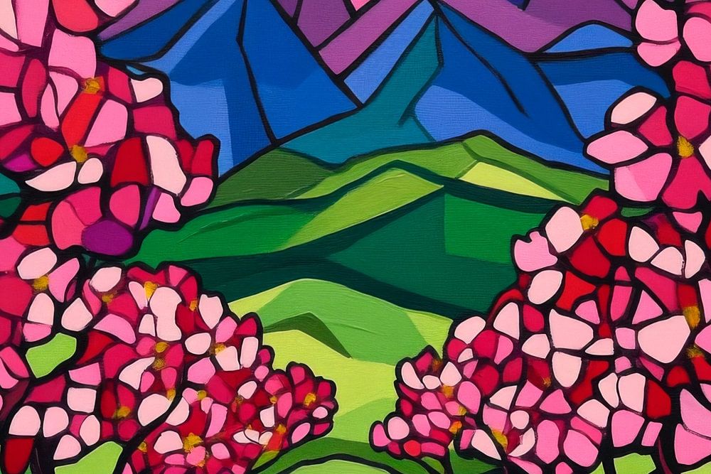 A vibrant symphony of bright pink and bold colour tones draws the viewer into a dreamlike landscape. The rolling hills seem to be in harmony with the majestic mountains, while the blossoming trees flank an inviting path that opens the heart to adventure and the beauty of nature.