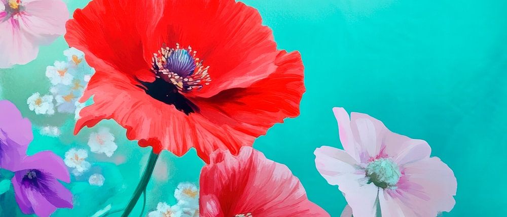 With vibrant colours and delicate flowers, this blooming scene radiates freshness and joie de vivre. The bright red poppies dance against a soft, mint green background and create a harmonious atmosphere. Ideal for the living room to create an inviting mood or in the bedroom for soothing dreams.
